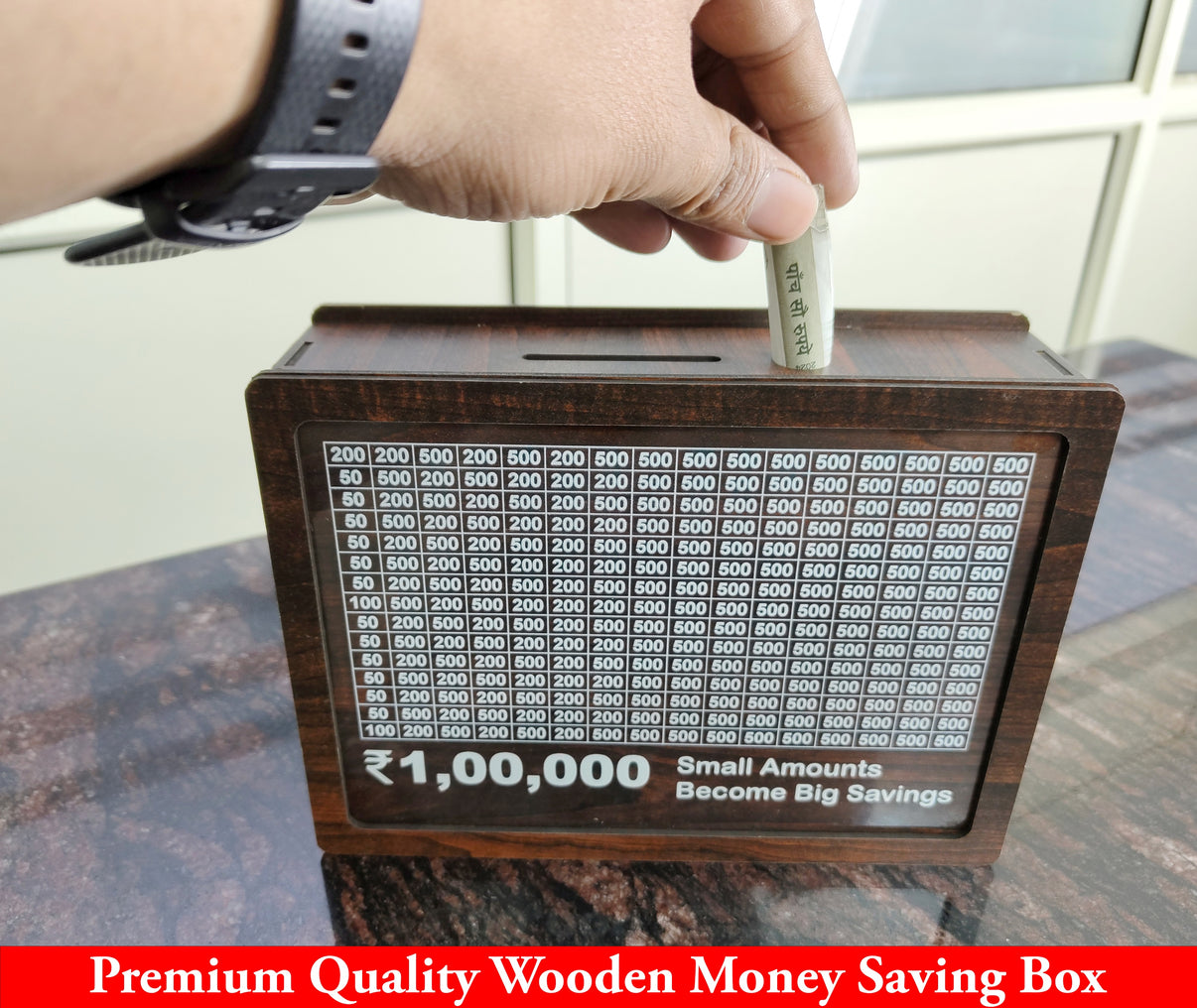 Wooden Money Saving Box | Cash Saver Money Box with Counting Target | 1,00,000 Savings Challenge Piggy Bank | Coin & Cash Bank for Boys, Girls and Adult | Durable & Eco-Friendly